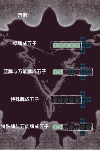 万能牌作用:可作为任意一种牌的牌面使用,即可与2种普通牌或特殊牌连成五子(但不具备特殊牌的替换功能),且放置规则与普通牌一致,必须放置在场内的任意一张牌的邻位。需注意万能牌不可单独成“五子”,必须与其他牌组合。