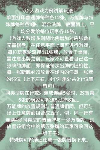 以下2人游戏为例子讲解玩法(如果大家喜欢这个玩法的话,请随意使用手边的纸或者其他材料,制作独属于自己的牌):单面打印普通牌每种各12张,特殊牌12张,万能牌8张。混合洗牌,平均分发给每位玩家各22张。推荐每张牌尺寸不超过5cm x 5cm。(当游戏人数增加,可随比例增加对应打印张数。推荐按照这个打印数继续游戏)在上传的打印文件中,蓝底牌与绿底牌为普通牌,黑底牌为特殊牌,红底牌为万能牌。